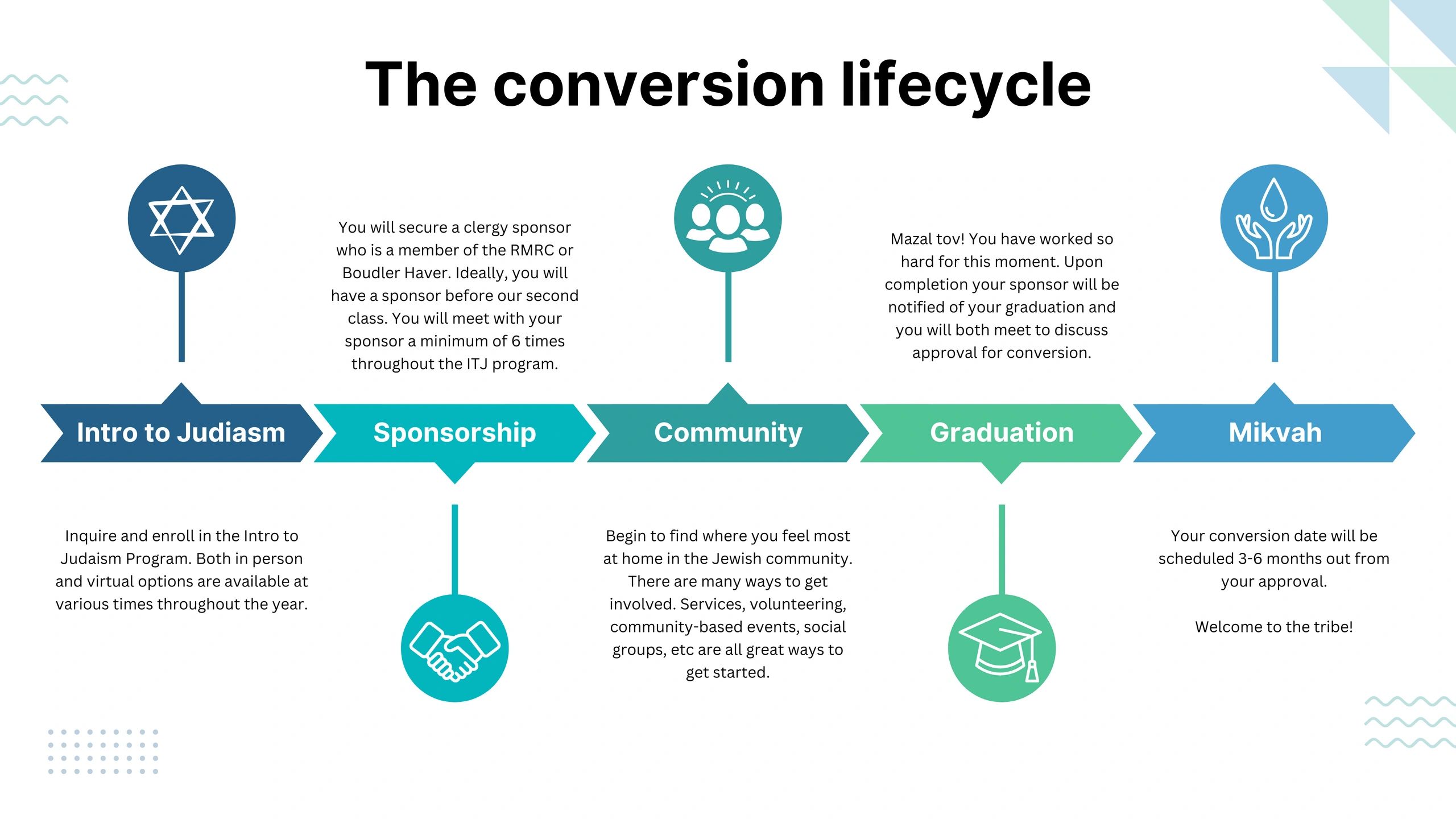 Below you'll see our guide to what your journey could look like. Everyone is on their own individual path, so in between each step could be road bumps, twists and turns. You may even change your mind. All of which are okay! When you're ready to start your journey to joining the Jewish people, click the button below to start your registration for the Introduction to Judaism program. We'll be in touch soon!